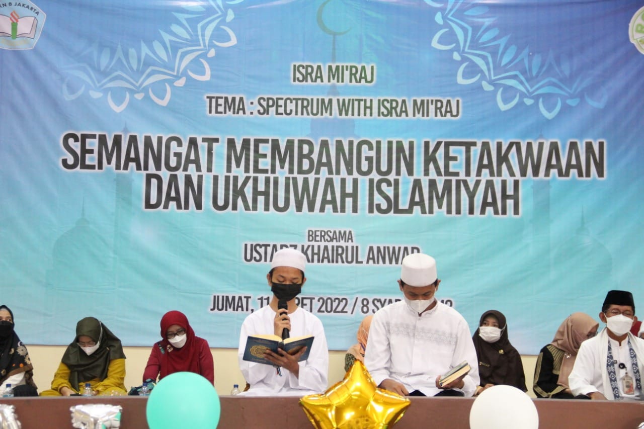 MUHASABAH dan ISRA MIKRAJ- Kegiatan keagamaan dengan tujuan peningkatan iman dan takwa diselenggarakan oleh SMKN 8 Jakarta yang tergabung dalam Rohani Islam pada Jumat, 11/3/2022 dengan pemandu kegiatan Guru PAI -Supendi, S.Pd dan Tausiyah oleh Ustad Khairul Anwar.