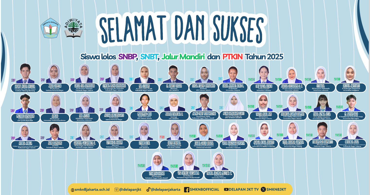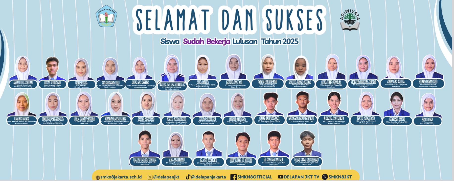 Selamat dan sukses luar biasa kami ucapkan kepada seluruh murid SMKN 8 Jakarta tahun ajaran 2024-2025! Keberhasilan kalian menembus ketatnya seleksi Perguruan Tinggi Negeri dan juga kesuksesan dalam meraih kesempatan berkarir di dunia kerja adalah bukti nyata dari dedikasi, kerja keras, dan kualitas pendidikan yang kalian dapatkan.